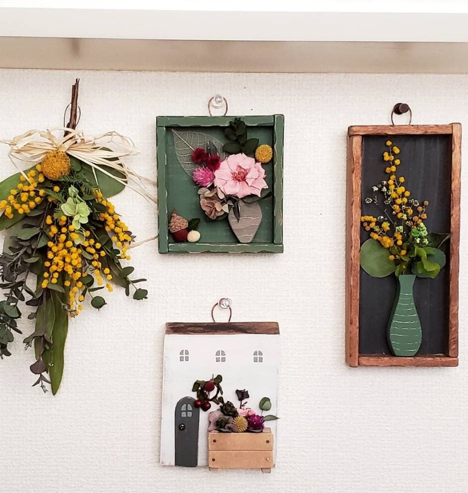 木の花瓶にお好きなドライフラワーを挿して楽しめる壁掛けのフレームで